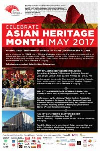 Submissions are to be emailed missingchapters@asianheritagecalgary.com  as soon as possible. Entries received by April 10 that are selected may be showcased during Asian Heritage Month in May 2017. Entries will be reviewed continuously until October 2017. We we look forward to hearing from the community!